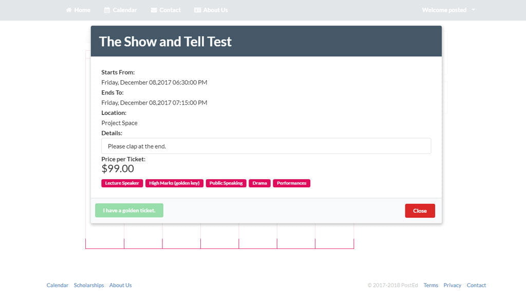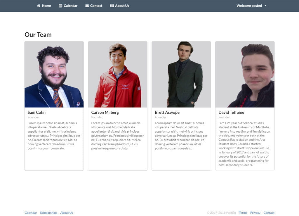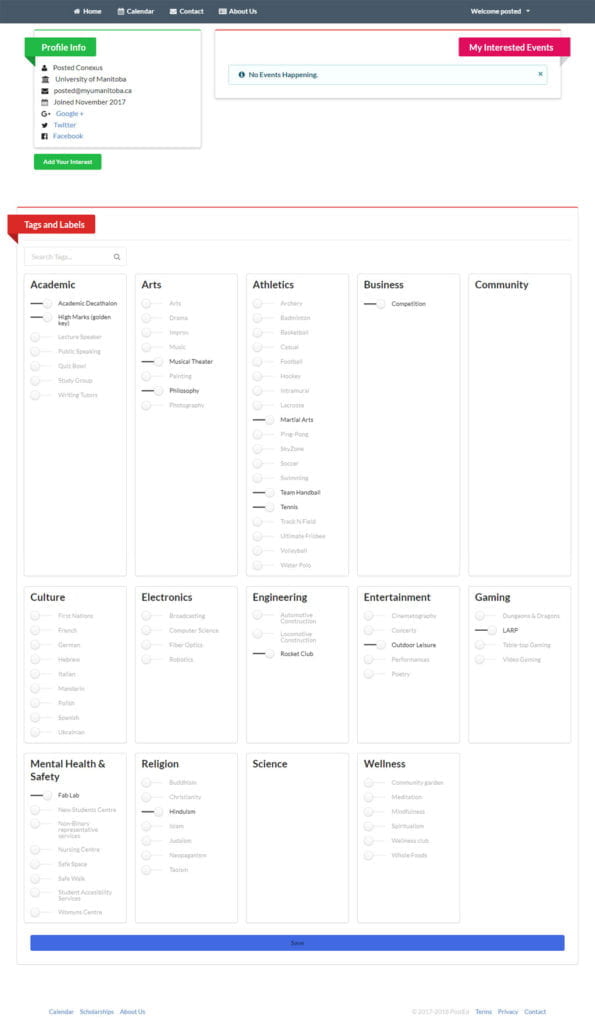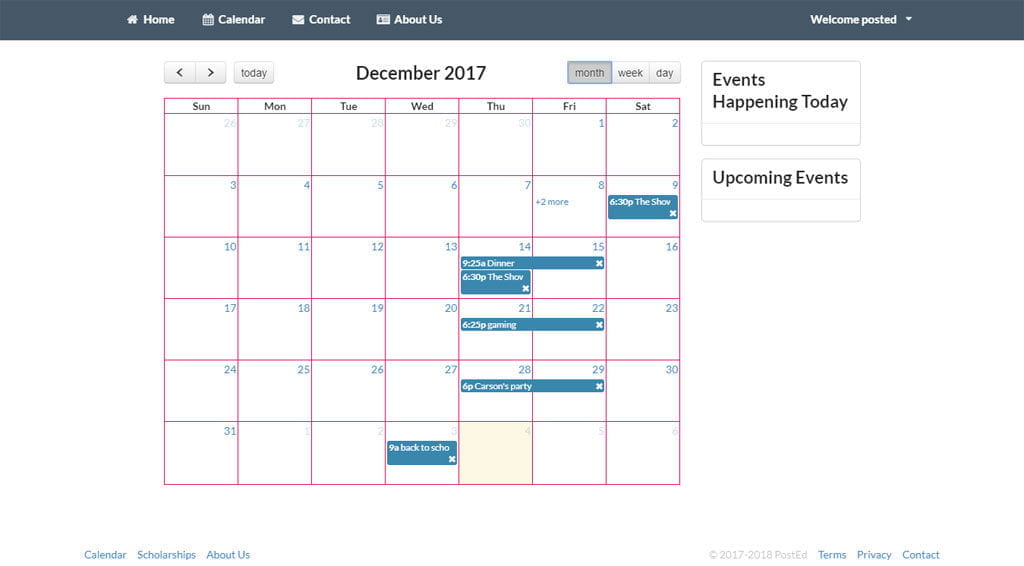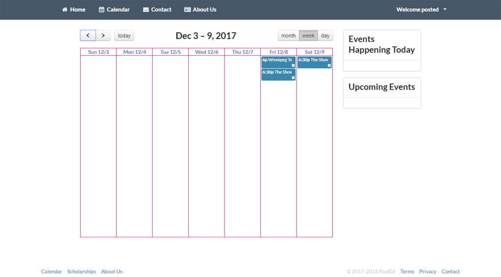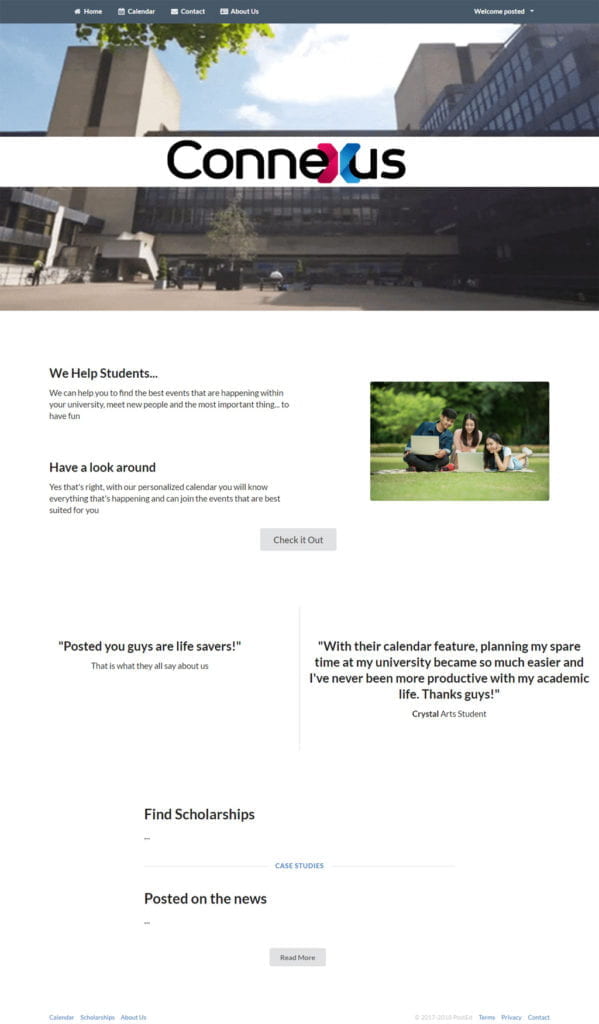 PostEd, formerly Connexus, is an idea that started from four university students: David Teffaine, Brett Swope, Sam Cohen and Carson Milberg. The purpose of the web application is to show nearby free and paid events on a user calendar within the app. Users will be able to show interest in a variety of events.