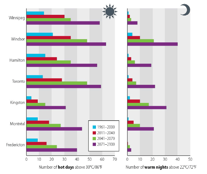 The graph below highlights the current and projected number of days exceeding 30 degrees Celsius for Canadian cities. You can see an increasing trajectory of the number of hot days for each Canadian city identified in the graph. The number of days with a maximum temperature of 30°C is projected to double by 2021-2040 and more than triple by 2081-2100, likely resulting in further heat-related mortality. Overall, Canada is projected to become much warmer, and urban areas tend to experience higher temperatures due to the urban heat island effect.