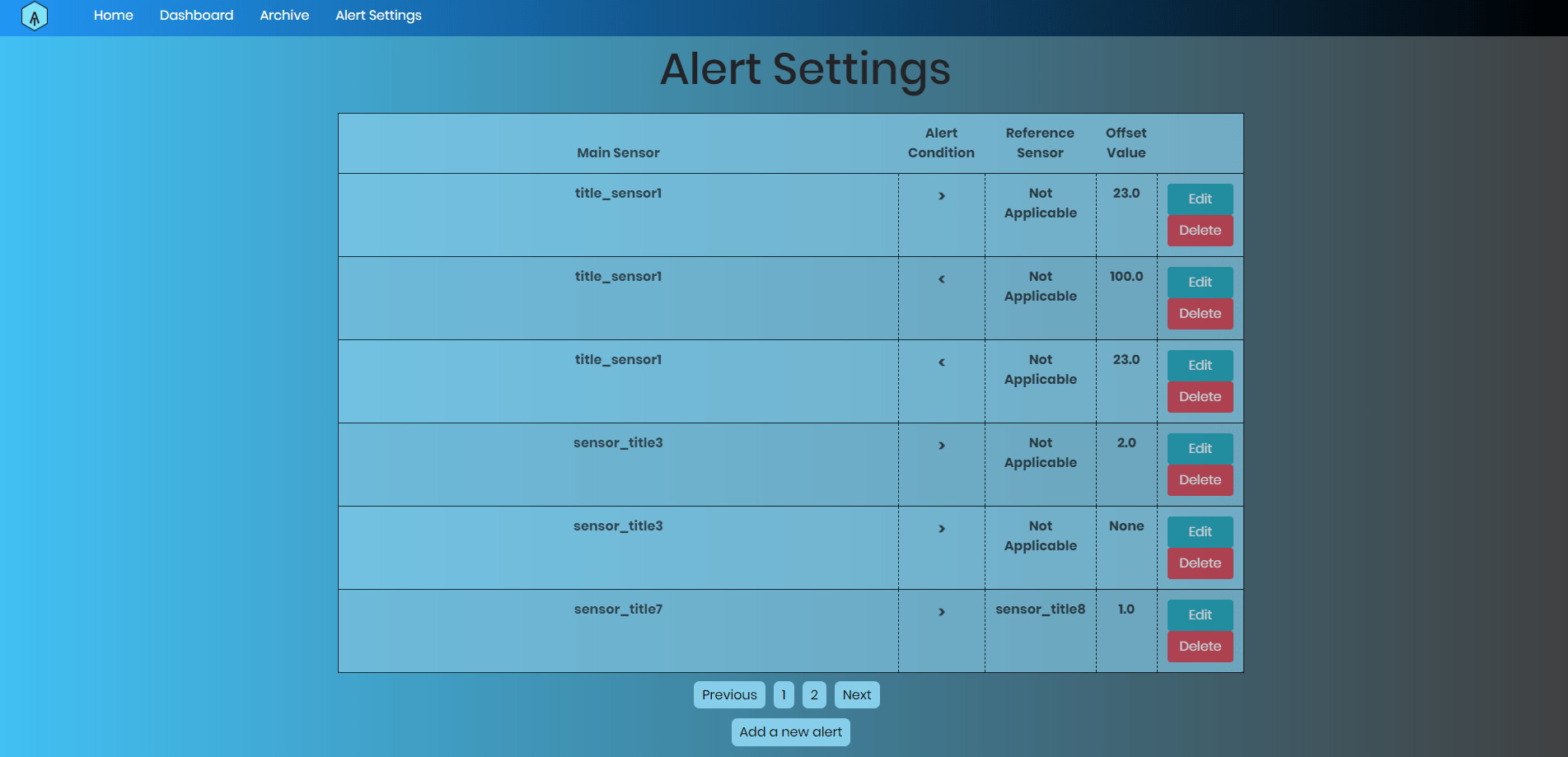 An Alert Settings page allows the user to create and edit alert conditions to notify users when conditions are satisfied. They can also delete alert conditions from this page. When an alert is triggered, it gets recorded into the application’s database so that they can be presented on the alerts column of the dashboard page.