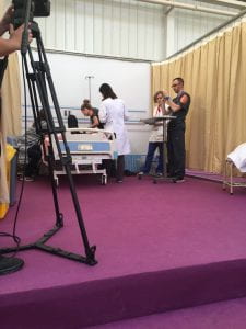 We anxiously anticipated our names to be called, so that we could begin our scenario. We were soon shuffled out of the room to our stage and given our scenario. We had 2 or 3 minutes, which felt like seconds to quickly read it, brain storm, delegate tasks, and remember all the points we had to complete, along with getting ourselves fitted for microphones on our own (which I put on us backwards, for the whole scenario). We were then asked are you ready, and they opened the curtain and said time has begun. We had 15 minutes for our scenario, which was very challenging, as we had a confused patient. We had to leave nerves at the door as much as possible, but it was not easy, especially when I was trying to get the bed to go up, and the bed was broken. We carried on as best we could assessing our patient, talking with them and the family, and applying our knowledge we have learnt while in school. Those 15 minutes felt like 5, and we were told our time was up, just as we finished. It was all over, and now the long wait, as we finished at 1015, and the closing ceremonies were not until 1600.
