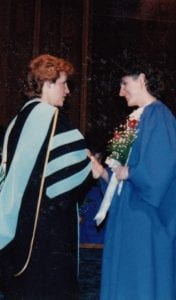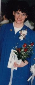 I remember being so excited to see my peers. We had been separated by our choices of Senior Practice sites and catching up with them before the start of the ceremony was fabulous. We wore blue graduation robes. I wore dove grey shoes (my favorite shoes of all time!) and carried 4 roses (one for each year of the program) in the processional. I also remember that we had organized a graduate’s choir and we sang a song as part of the ceremony. I clearly recall the pride I had when Dr. Larsen the Dean of Nursing pinned the pin to my gown. Sharing that moment with my family was profound and I truly felt I had made it!