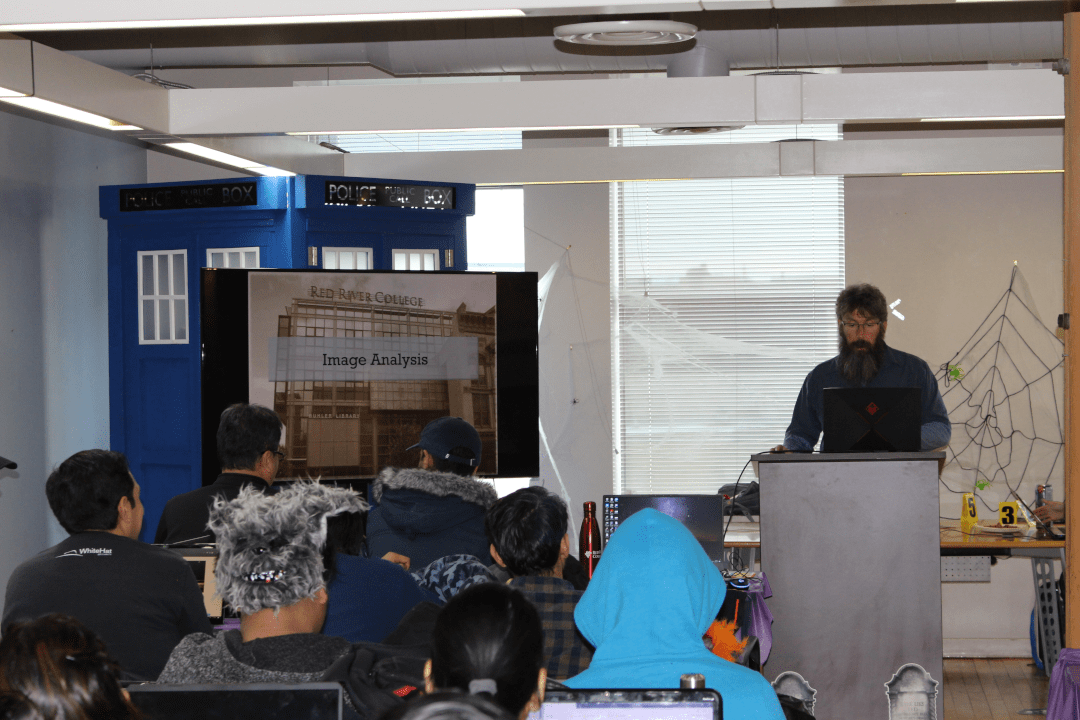 The Information Security program from the Applied Computer Education department at Red River College is only in its second year, yet interest in the program and the field of information security has never been greater. And it shows. The Information Systems Audit and Control Association (ISACA) student group at Red River College hosted its first ever annual mini-conference on Halloween at the ACE Project Space and it was a full house with over 70 students in attendance. Part of this group included high-school students from Seven Oaks School Division Met School and Maples Met School. Students enjoyed presentations from industry experts and one of our own information security instructors.