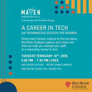 Red River College, Tech Manitoba’s MAVEN program and local tech companies want to help you retool for a career in tech. Join our conversation and learn about the many fulfilling and lucrative opportunities in the field of technology. The event is FREE and includes beverages and a light snack.