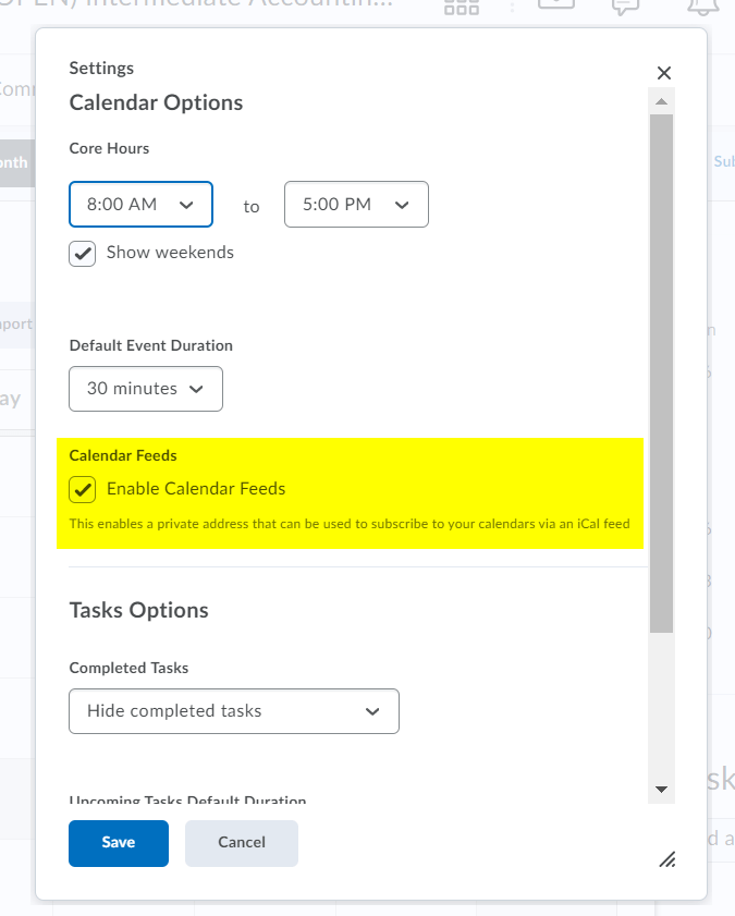- A pop-up window will appear. Within the pop-up window, check off the box beside “Enable Calendar Feeds”.