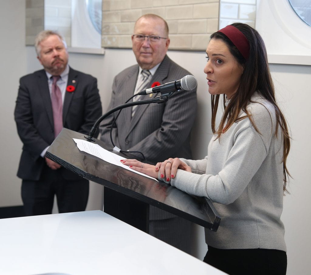 Hailey Jefferies speaks at the grand opening of the Prairie Research Kitchen, as RRC Interim President Darin Brecht and Minister of Economic Development and Training Ralph Eichler look on.