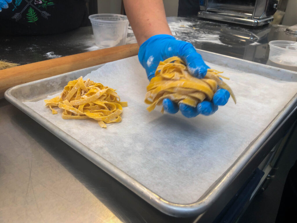 During the project, students rolled out egg-free quiches and custards, kneaded lupin-based pasta, and crafted lupin tart shells. Their freshly prepared creations were then shared with Main Street Project, helping serve nourishing, thoughtfully prepared meals to our relatives.