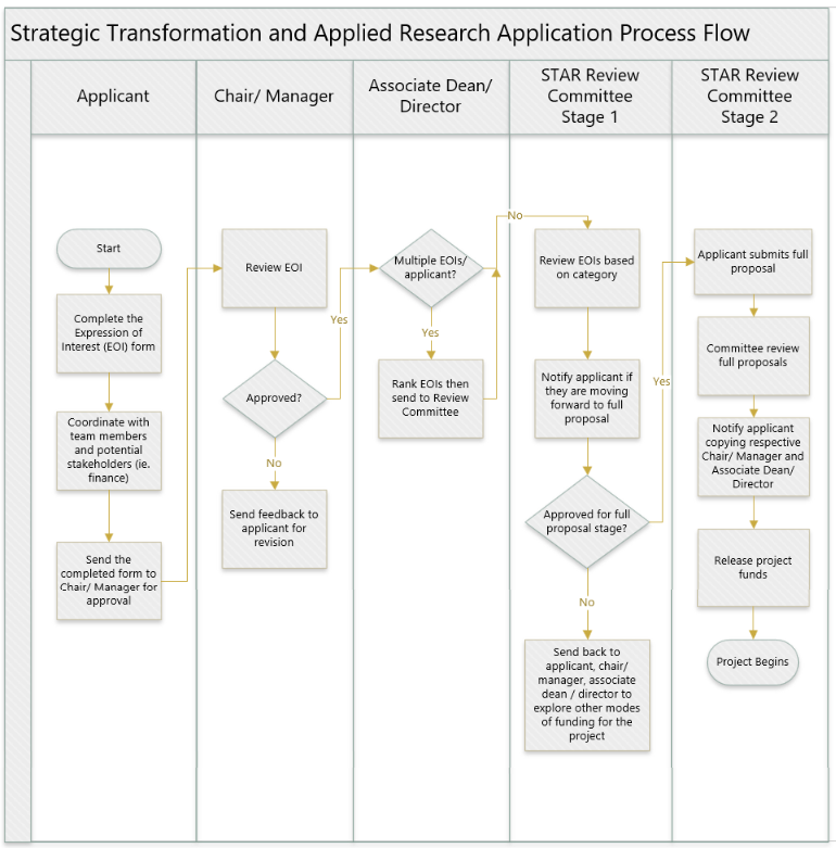 The completed expression of interest must be sent to the Chair/Manager and Associate Dean/Director for review and approval to be considered by the STAR Review Committee. If there are multiple EOIs coming from one School, the Associate Dean will have the option to rank the applications prior to sending to the STAR review committee.