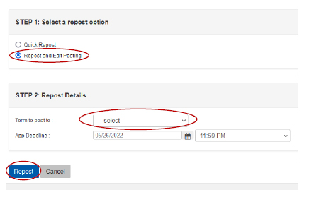 If you would like to edit the job description or details before posting, click Repost and Edit Posting. You can then choose a new application deadline and term to post it in (reminder: choose the date range when the position is expected to start in). Then, click Repost to be taken to the job posting form.