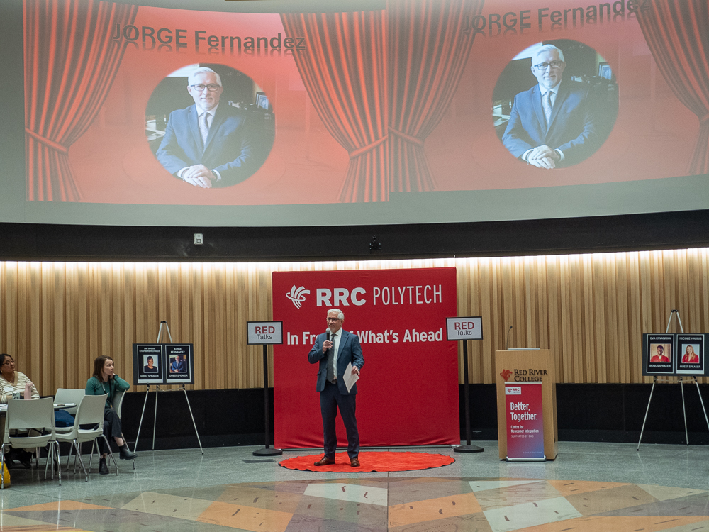 Jorge Fernandez, CEO of the Immigrant Centre, followed with reflections shaped by his own arrival in Canada from Ecuador. What began as a role supporting Spanish-speaking students in a Winnipeg classroom grew into a decades-long commitment to helping newcomers build strong, confident and connected lives in their new communities.