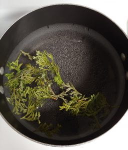 - Pour hot water into tea pot and add crushed cedar leaves.