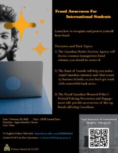 Fraud Awareness for International Students RCMP Virtual Information Session will be a great place to start. The Royal Canadian Mounted Police(RCMP)’s Federal Policing Prevention and Engagement Unit has organized this virtual session to ensure that if you are targeted, you will be able to recognize the scam and know what to do next. There will be presenters from the Canada Border Services Agency(CBSA), Bank of Canada, and RCMP.