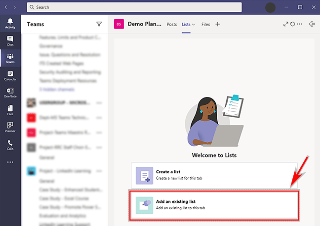 5. To add an existing list, on the Lists tab, click Add an existing list.