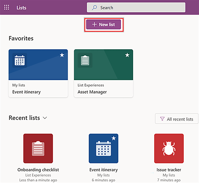 On the Lists home page (refer to the How do I access Microsoft Lists section), click New list at the top of the page, and then proceed to the What types of lists can I create section.