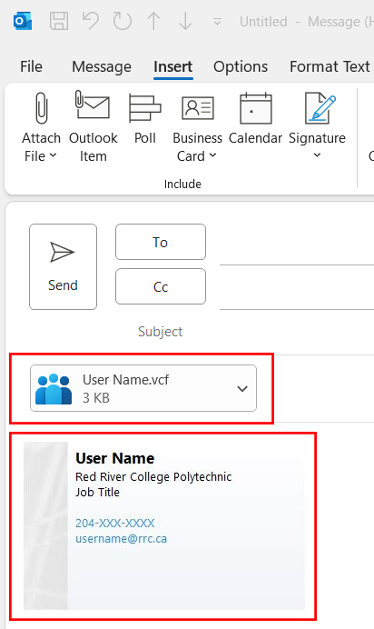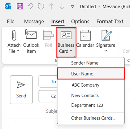You can insert your business card into a new email, a reply email, or a forward email.