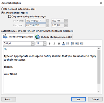 Automatic Replies (formerly called Out of Office Assistant) sends a customized response to a sender’s first email. The automated reply informs the sender that you are out of office, on vacation, or otherwise unavailable to respond to emails. Your out of office message informs senders to expect a delayed response.