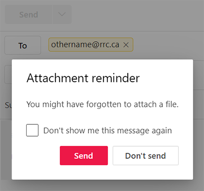 Outlook on the Web has an intuitive feature to alert you to attach a file. This happens because Outlook on the web interprets the text in your email and displays a warning message that you might have forgotten to add an intended attachment. This image will appear, after you click Send. You can click either Send if no attachment is required or Don’t Send so that you can insert a file before sending.