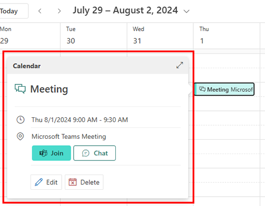 Left click on any calendar entry for its details, including a link to Join a meeting.