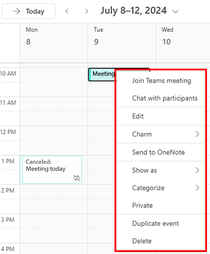 Right click on an event for the menu to edit, categorize, delete, and you can even join the meeting from here as well. Options for each entry may differ based on the calendar entry type.