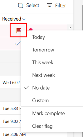 Hover over an email and then locate the icons on the right side under the Received heading. You can: