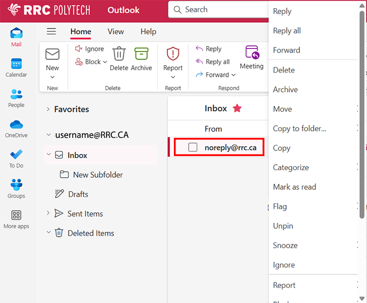 Right click any email to open more options, including: reply, reply all, forward, delete, move, copy, categorize, mark as read/unread, create a rule, amongst many others.