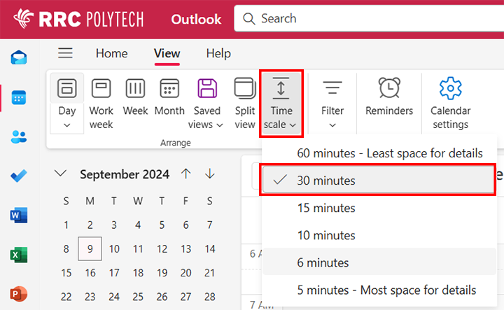 The default time space within your calendar is 30 minute sections. You may select the option that suits your needs.