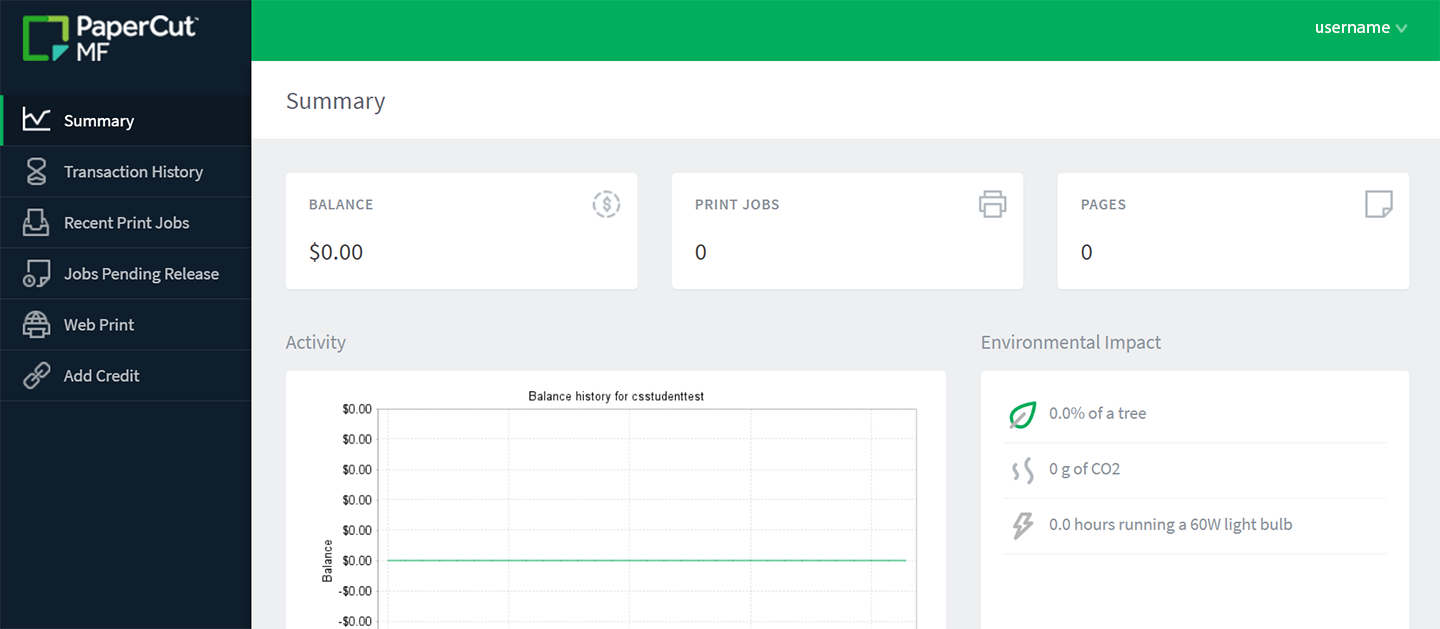 4. The left side menu provides your summary, transaction history, and recent print jobs.