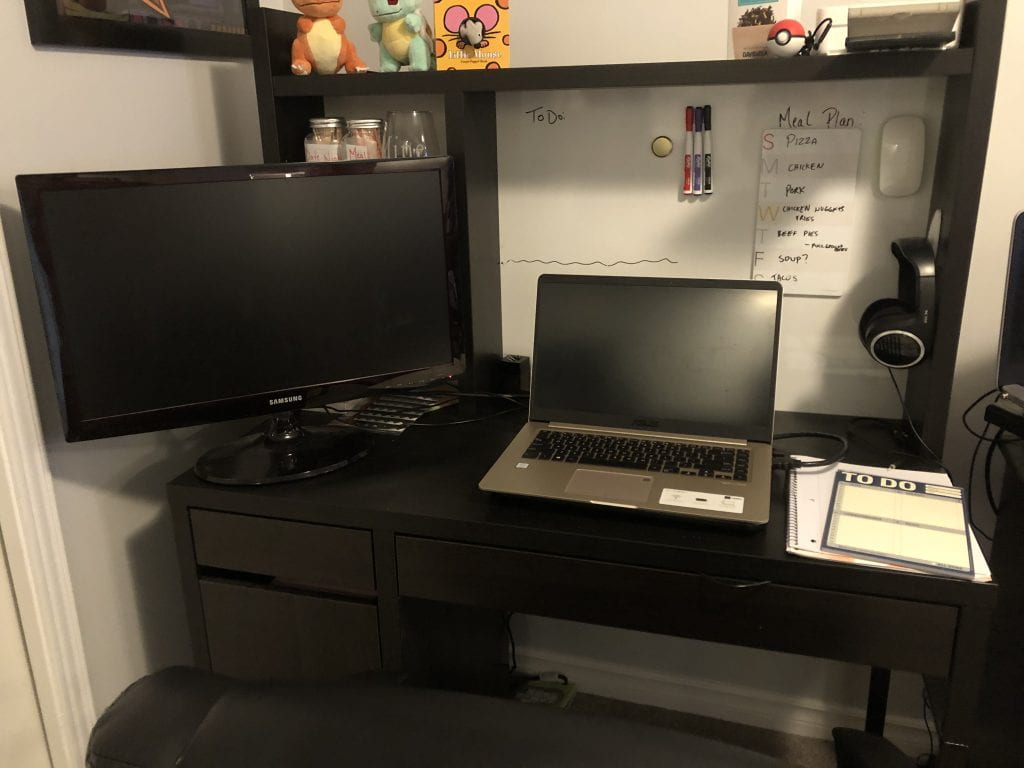 The first week that we started classes online, I felt displaced and couldn’t quite figure out a way to stay focused on my studies. I recognized that I was struggling to balance my study time with my home time and as a result, I felt quite restless. By the second week, I recognized that bringing my laptop with me as I moved around my home wasn’t working, so I decided to set up a work station. I cleared my computer desk of all things not school related and set up a second monitor to attach to my laptop, which created a dynamic work space with two screens.