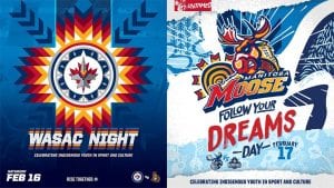 The logos are being used to promote two special hockey games: the Winnipeg Jets WASAC (Winnipeg Aboriginal Sport Achievement Centre) Night on Sat., Feb. 16, and the Manitoba Moose Follow Your Dreams Day on Sun., Feb. 17.