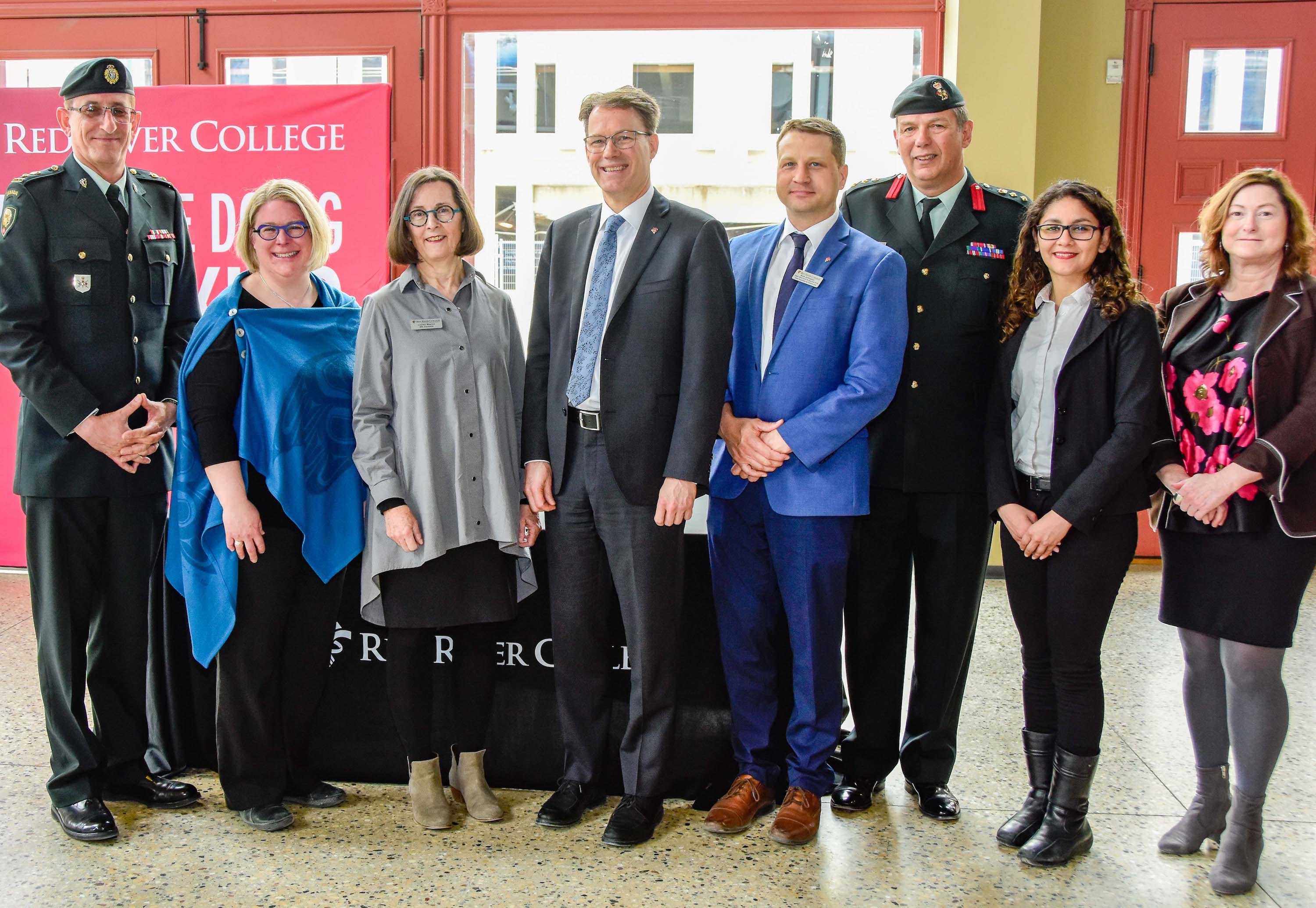 (Shown above, from left: Lt.-Col. John Groves, Deputy Commander, 38th Canadian Brigade Group; Dr. Christine Watson, Vice-President, Academic, RRC; Lauren Waples, Recognition of Prior Learning Facilitator, RRC; Paul Vogt, President and CEO, RRC; Kirk Johnson, Dean, School of Business and Applied Arts, RRC; Col. Nigel Whittaker, Assistant Chief of Staff Support, 3rd Canadian Division; Kay Kuri, Advanced Placement Prior Learning Programs, BCIT; Lisa Jamieson, Chair, Applied Commerce and Management Education, RRC.)