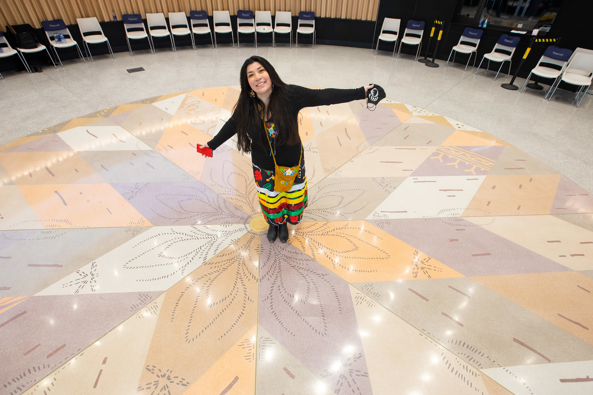 Today, RRC Polytech unveiled Anishinaabe/Nêhiyaw/British artist KC Adams’ Morning Star design — which is embedded within the floor of the College’s new Roundhouse Auditorium — at the official opening of the space at Manitou a bi Bii daziigae.