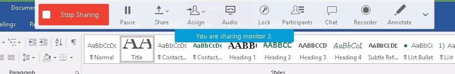 Share your screen and allow participants to share their screens with you. Sharing your screen allows you to demonstrate software, give feedback on assignments, and troubleshoot problems students may be having.