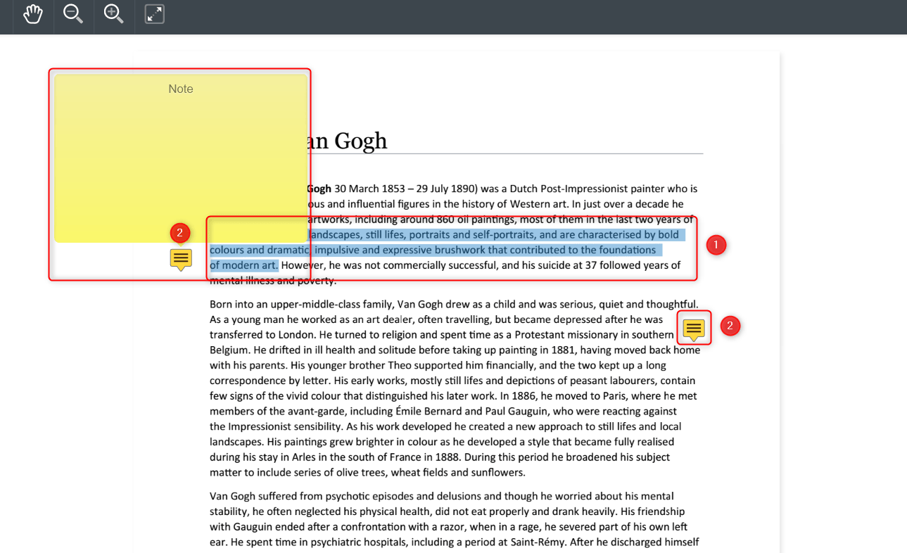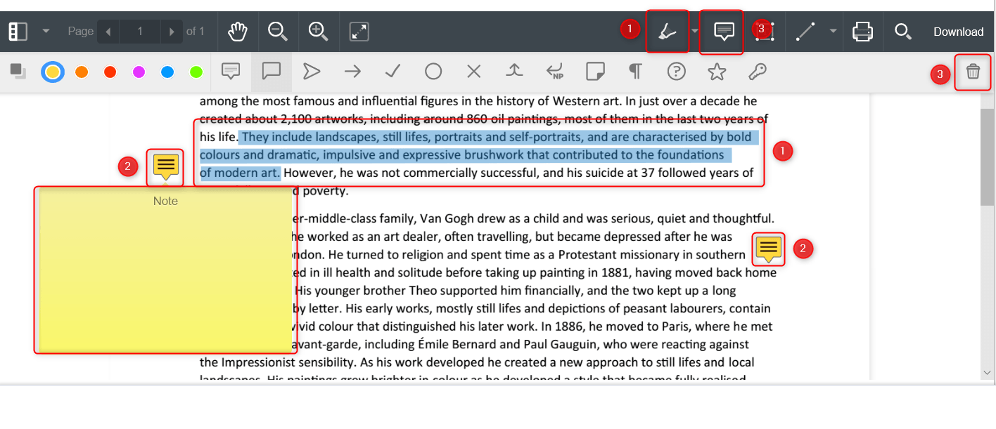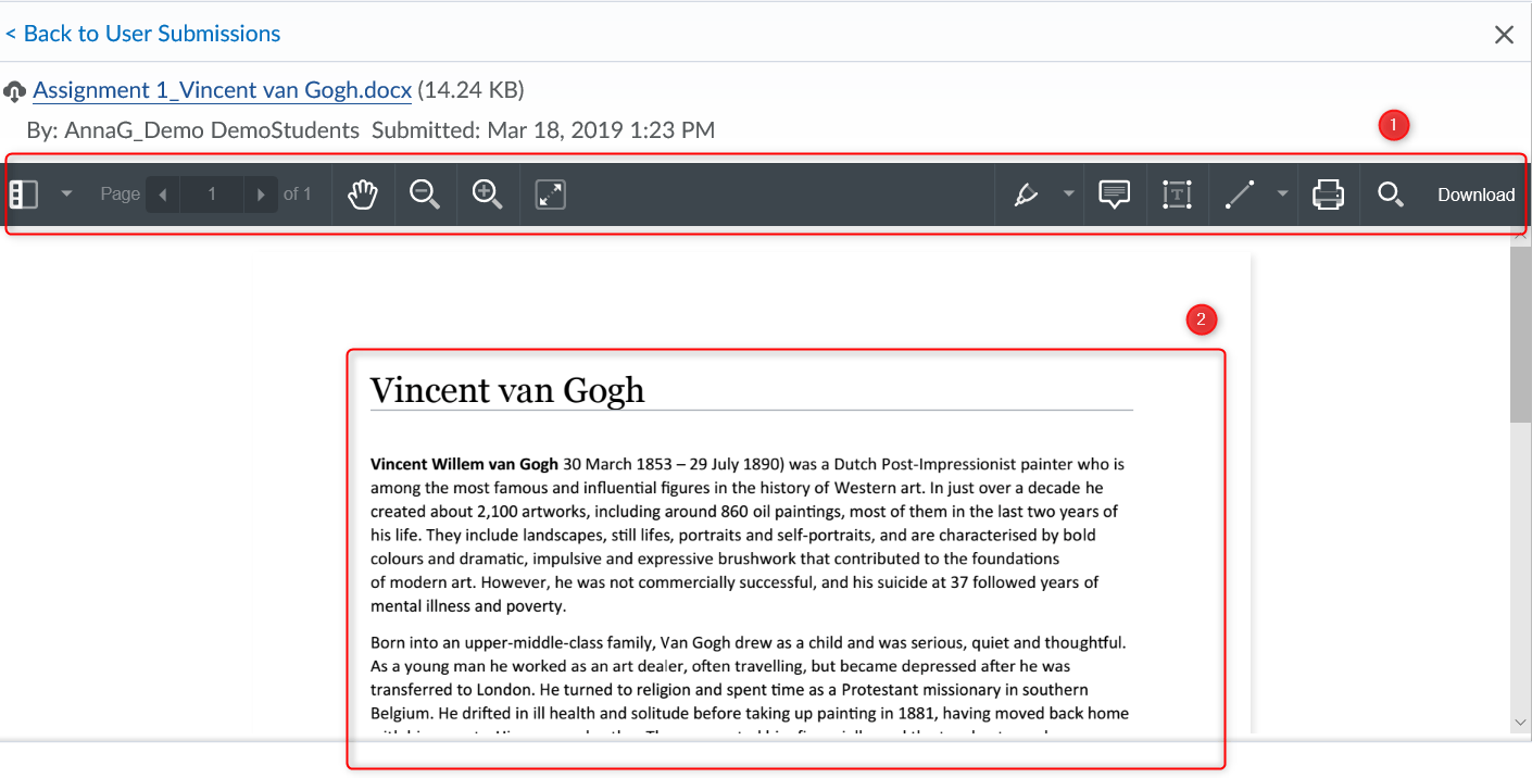 Instructors can now use the built-in annotation toolbar in Assignments to provide contextual feedback with highlighting, free hand drawing, shapes, and associated commenting. This allows instructors to complete all their evaluation and feedback work directly in Assignments, without the need to use any external tools or applications. Annotations remain editable until the feedback is published by the instructor. If instructors want to add additional feedback after publishing, they can update the annotations and re-publish them.