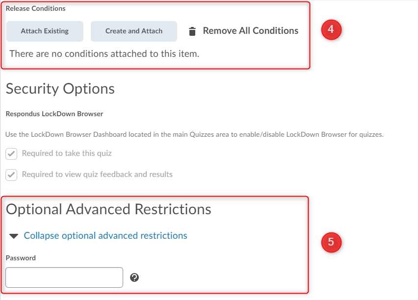 Release Conditions (4) allow you to associate a quiz with other items in LEARN. For example, you can require that users meet some criteria, such as reading a set of lecture notes in Content, before they can take a quiz. You can also make a submission to the assignment a criterion for accessing a quiz.