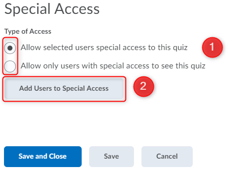 Special access permissions allow you to set different availability dates and times for specific users. For example, you could extend the deadline for users who require remedial help or who are taking the quiz beyond the original scope of the quiz. You can also add special access after a quiz’s end date has passed for users who have a legitimate excuse for missing the deadline.