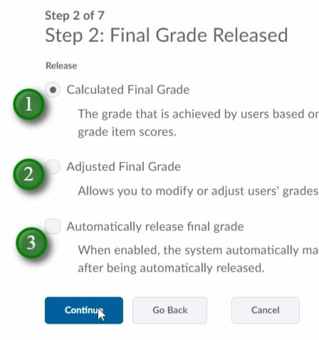 When using the “Gradebook Setup Wizard” to apply the initial settings in the gradebook, you will have decided if you wanted to release the final calculated or adjusted grade to the students. This setting will only affect what the student is able to see. For your reference and purposes both the calculated and adjusted final grades are available. You will notice throughout the wizard, and when you view the gradebook settings that there are distinct settings for student or instructor view.