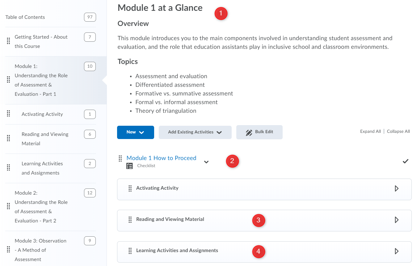 All elements of a course can be linked into and organized in the content area. Your quizzes, assignments, discussions, etc. can all be organized into easy to follow modules.