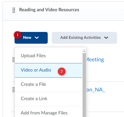 In the Content tool, click New (1) and select the Video or Audio (2) option.