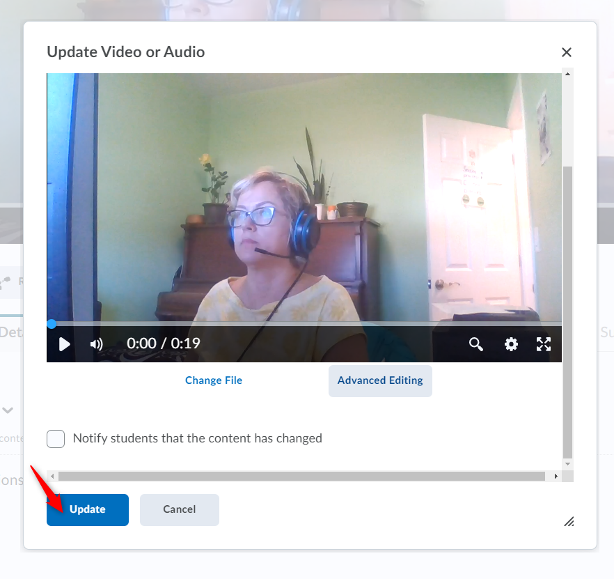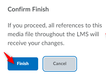 You will be asked to confirm your decision to update the video, reminding you that your updates will affect all the instances of this file in all the places it exists in Brightspace. Click Finish to proceed.