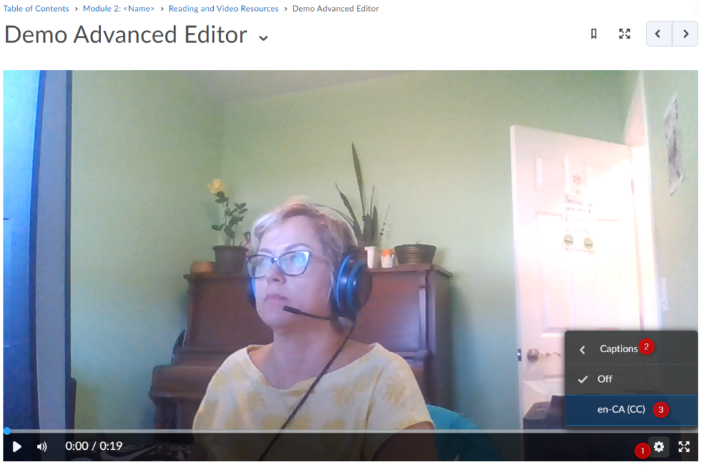 To enable captions in the video, click on the gear cog (settings) (1), click on Captions (2) and choose CC (3).