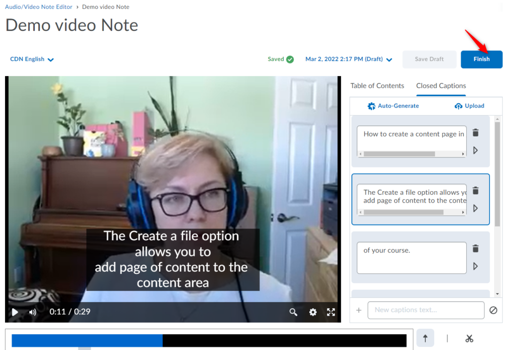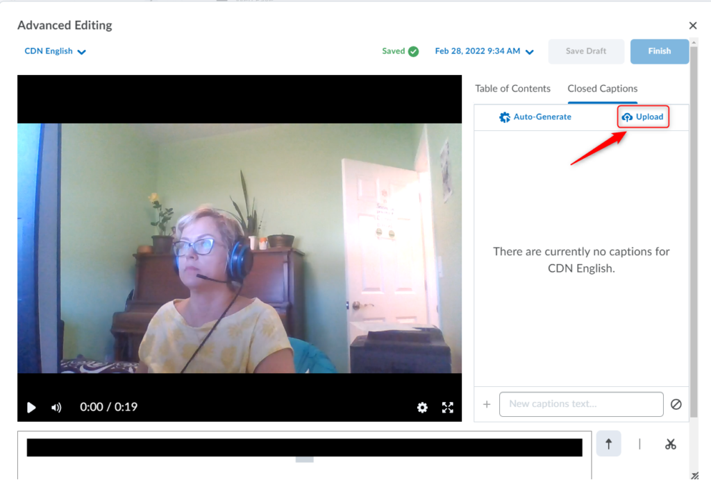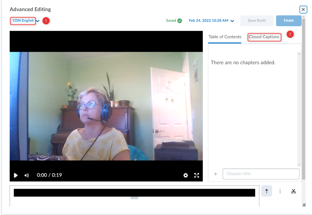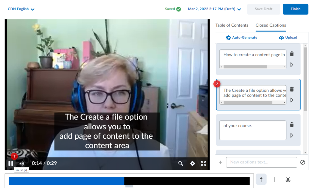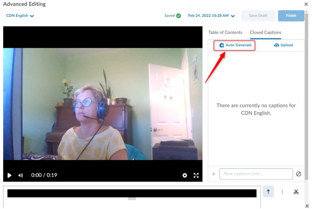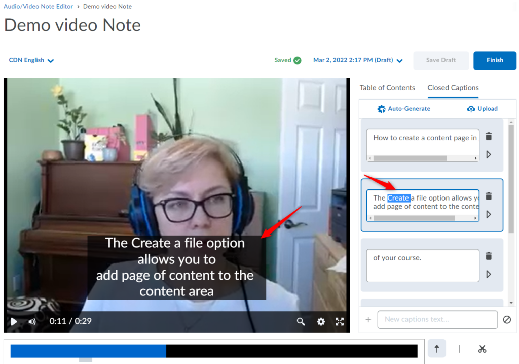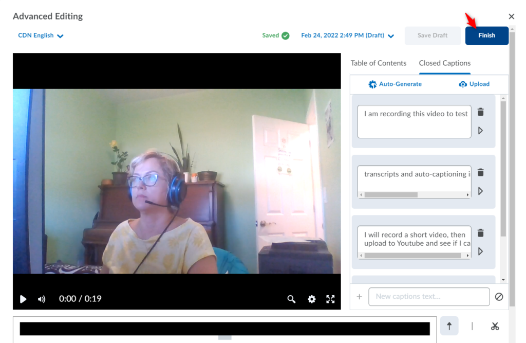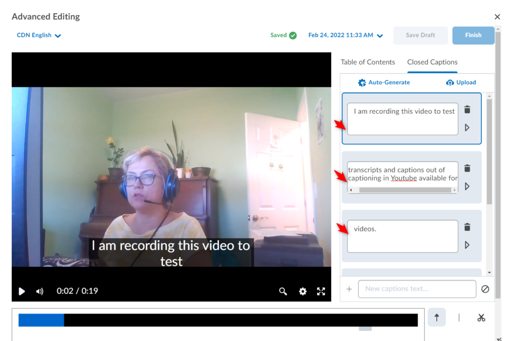 Important: As with any automatically generated captions, you should verify the accuracy of the captions. You will not be able to proceed to Saving/Finishing the video until you modify/edit at least one of the words in the Closed Captions, even if you find the captions accurate. To do so, simply click/highlight the word, delete and then retype it. The updated captions will immediately appear in your video preview. You can also add new captions to existing sections. The Save as Draftand Finish buttons will become active, so you can proceed to saving your video with the updated Closed Captions.