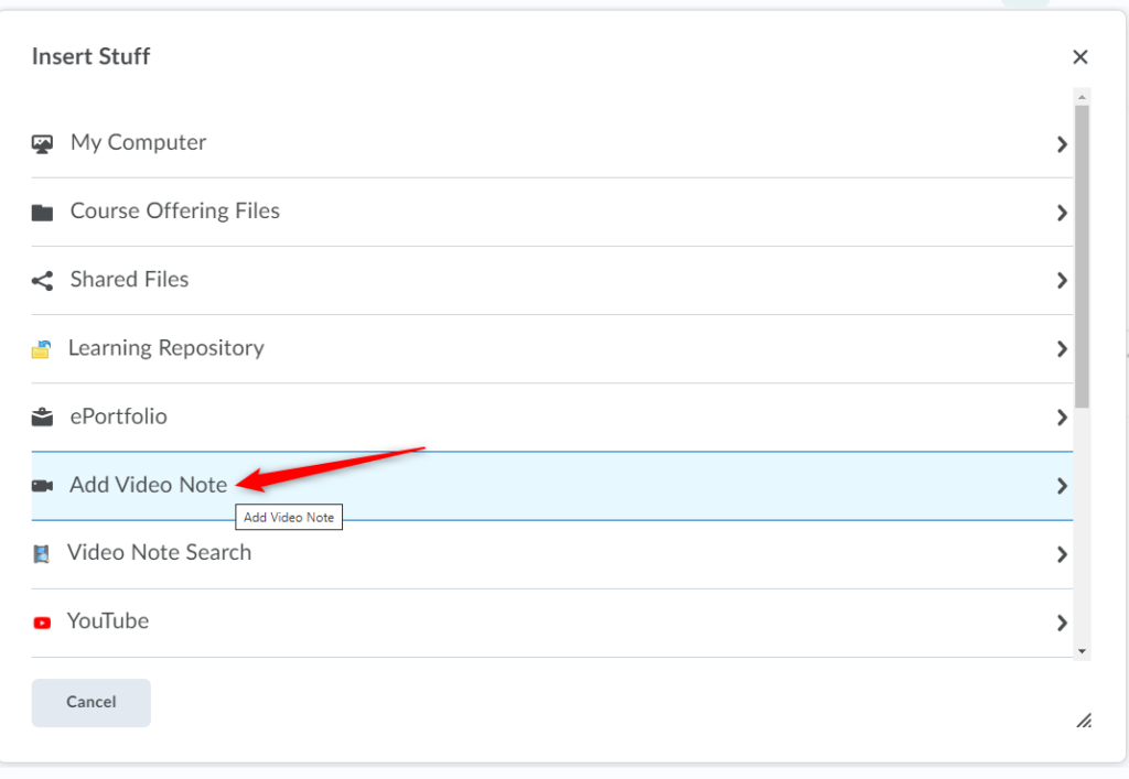 Select Add Video Note from the Insert Stuff option in the Brightspace Editor/HTML Editor.