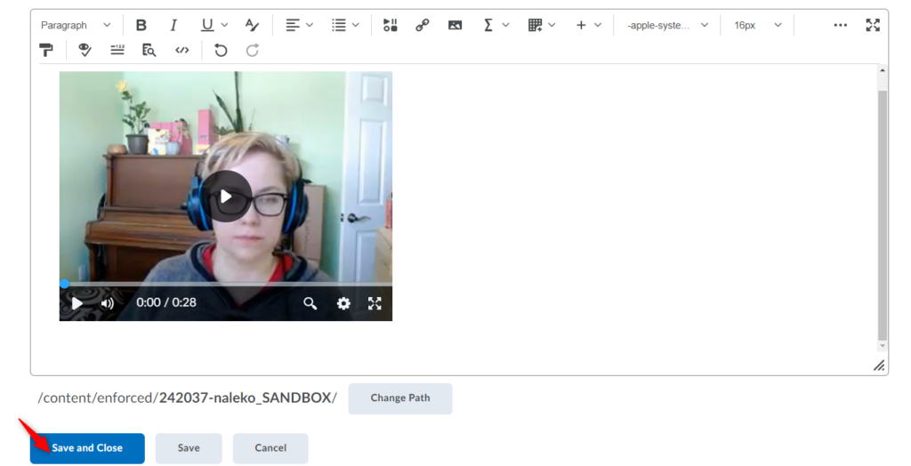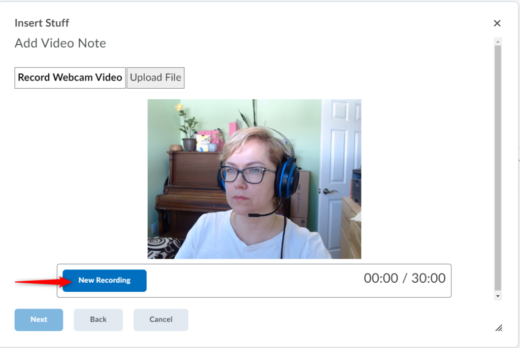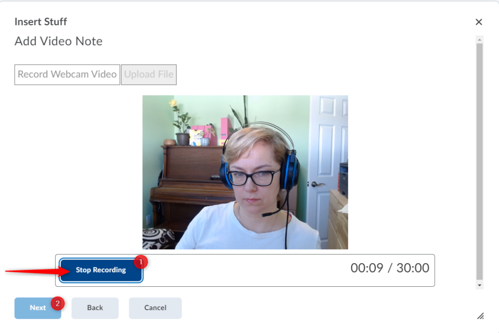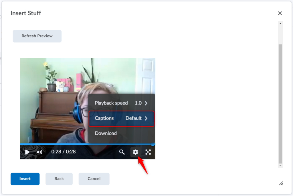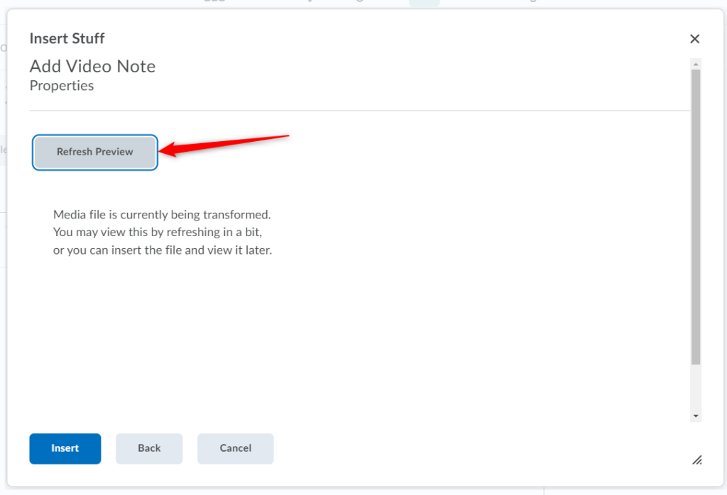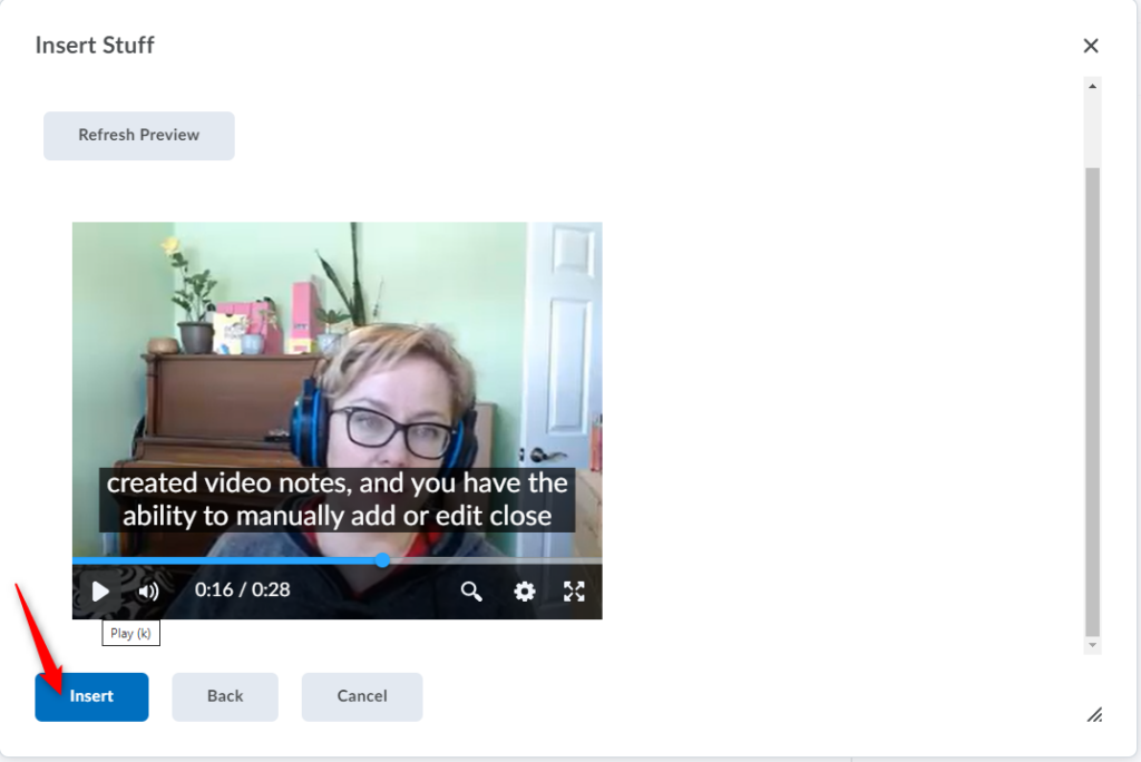 When done previewing your video note, click Insert to add your video note to the Brightspace editor.