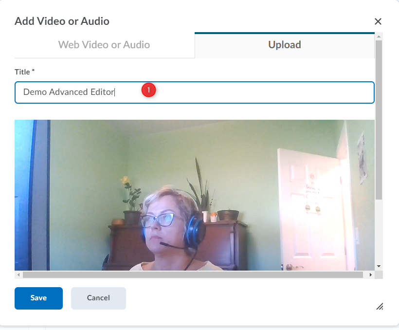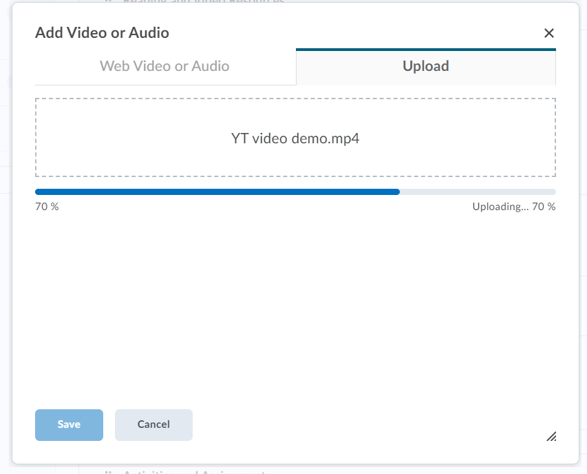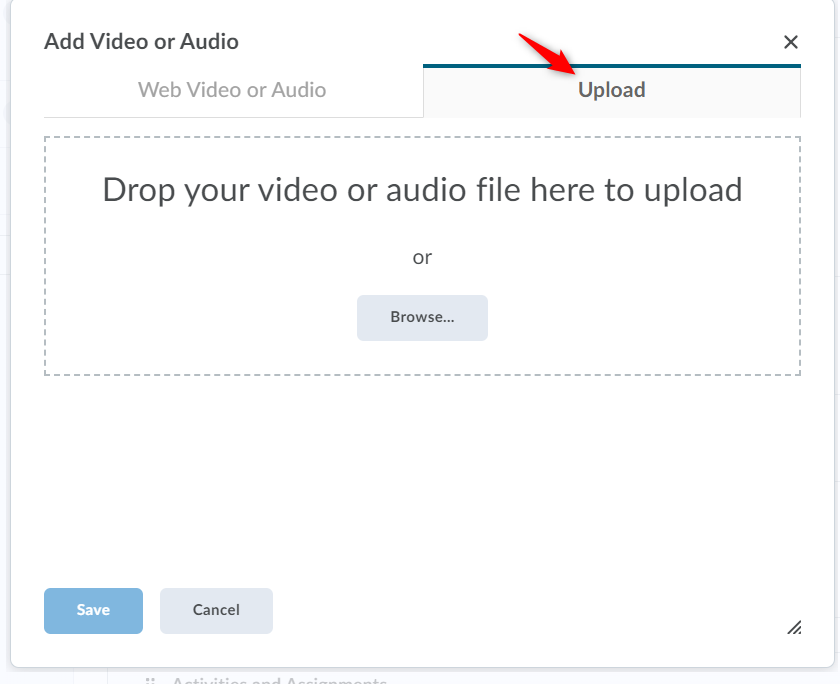 In the Add Video or Audio window, select the Upload tab. You can use Browse or drag your video file into the upload space.