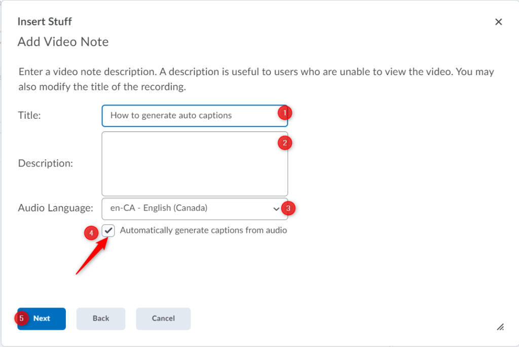 Enter a title (1) and description (2) for the Video Note. Choose the audio language (3) and check the “Automatically generate captions from audio” box (4). Click Next (5) to proceed.