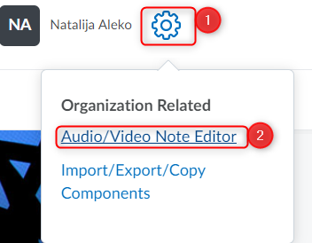 Click on the cog icon (1) in the top right corner of your course page and select Audio/Video Note Editor.