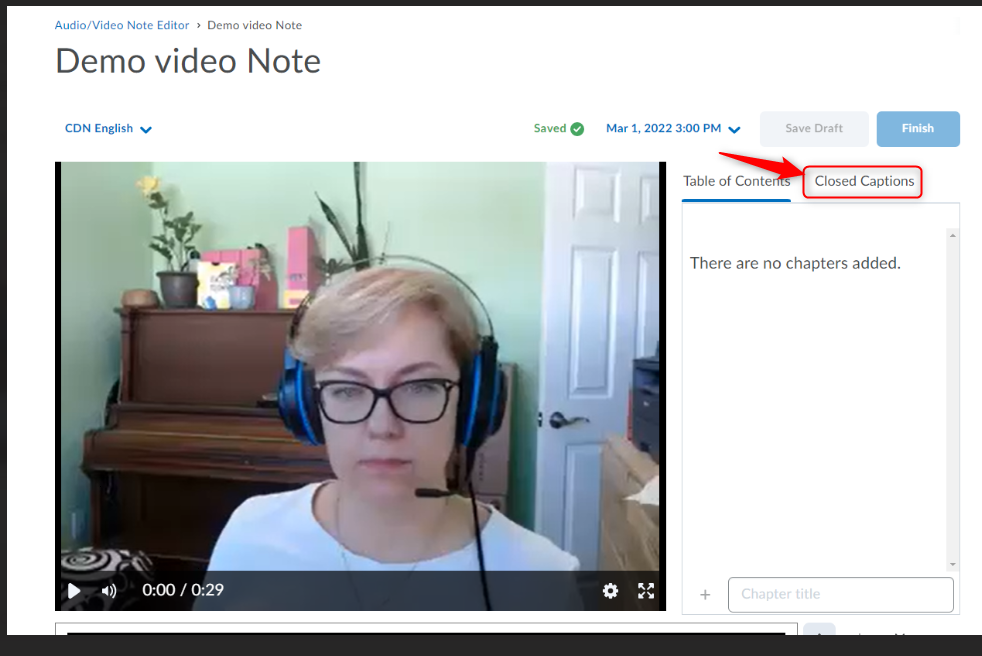 Select the Video Note from the list and click on the Closed Captions tab.