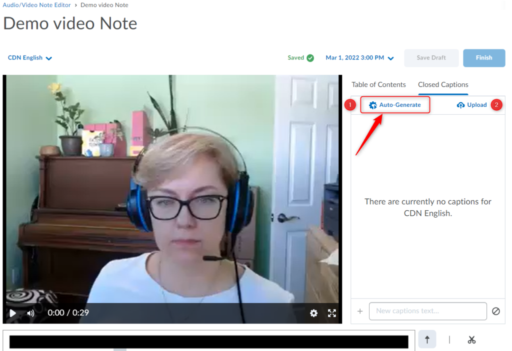 For automatic captions, click Auto-Generate (1) OR to upload a caption file, click Upload (2) and navigate to the captions file.