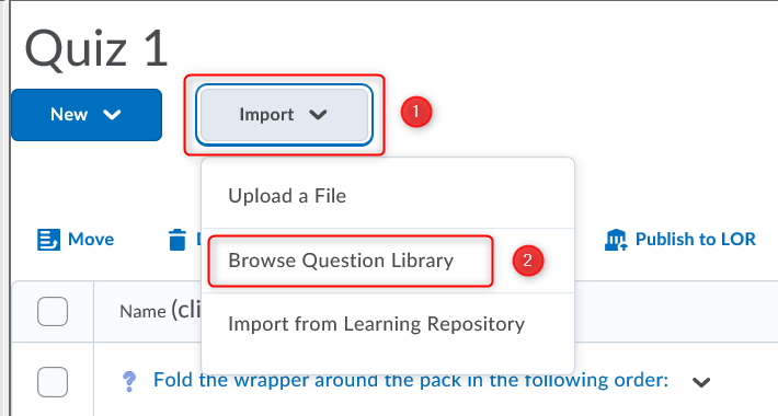 4. From the ‘Import‘ (1) drop-down menu, select ‘Browse Question Library‘ (2).