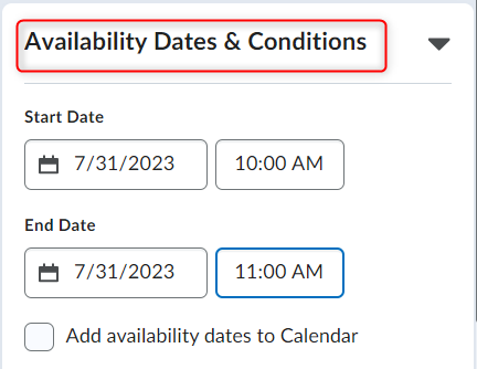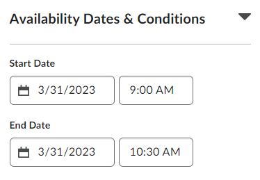 Note: It is not advisable to set an end date/time that is before the time limit applied to an assessment will be up. Students who experience internet issues after the end time will not be able to re-enter the exam and will need to be readmitted to the quiz by the instructor through Special Access.
