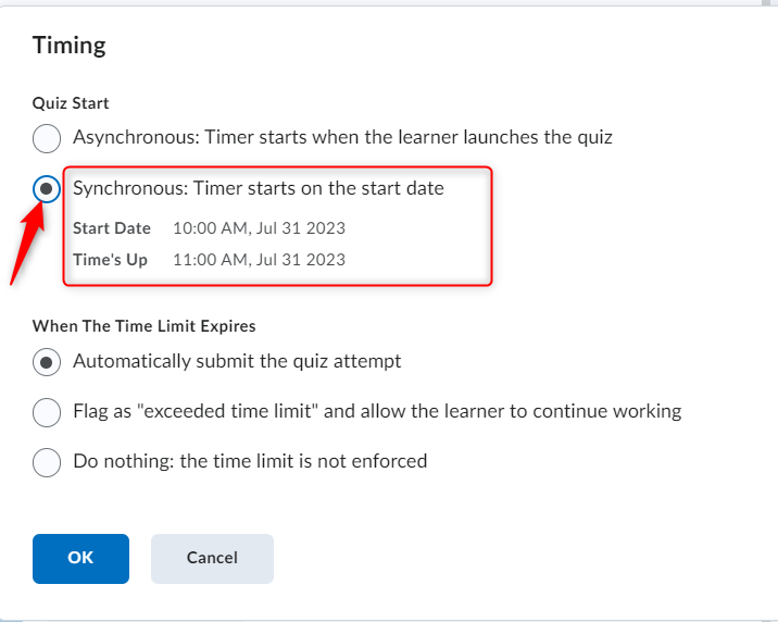 Instructors can set up synchronous quizzes in which the quiz time limit starts and ends at the same time for all students, regardless of when a student started the quiz. This feature supports medium-high stakes quizzing when an instructor requires all learners to take the quiz at the same time, similar to in-classroom quizzing. Synchronous Quizzes are the only option to ensure a dedicated start and end time/cutoff using the quiz tool.